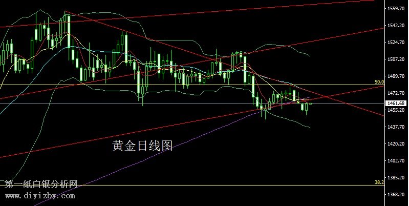 昨日黃金早盤開盤在1454.6的位置后行情先小幅拉升給出1459附近后行情開始回落,最低給到了1449.9的位置后行情受到美指回落的影響行情快速拉升,最高觸及到了1462.8的位置后行情整理,日線最終收線在了1461.2的位置后行情以一根下影線很長的大陽線收線,而這樣的形態收尾后,日線具備技術反彈的潛力,操作上,今日的行情1457-1458多止損1453上方目標看1463和1466.破位看1472壓力。
