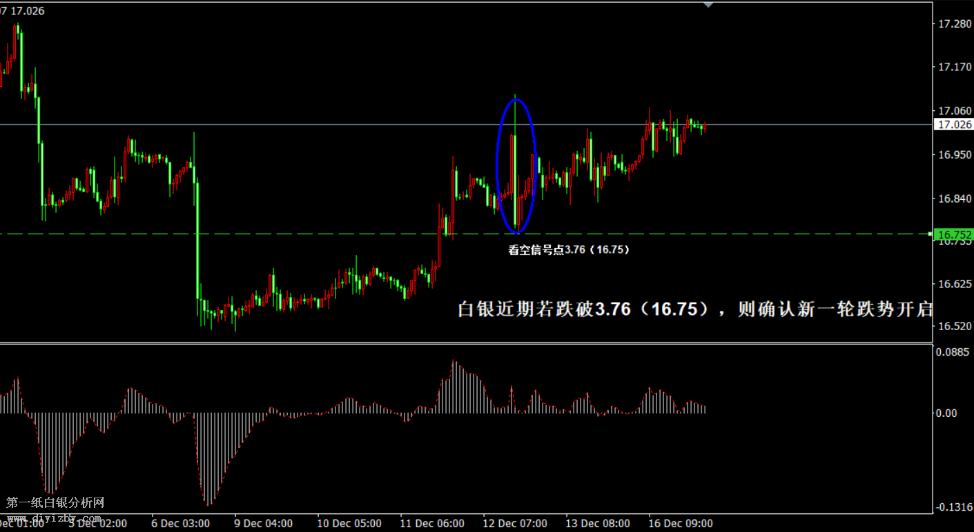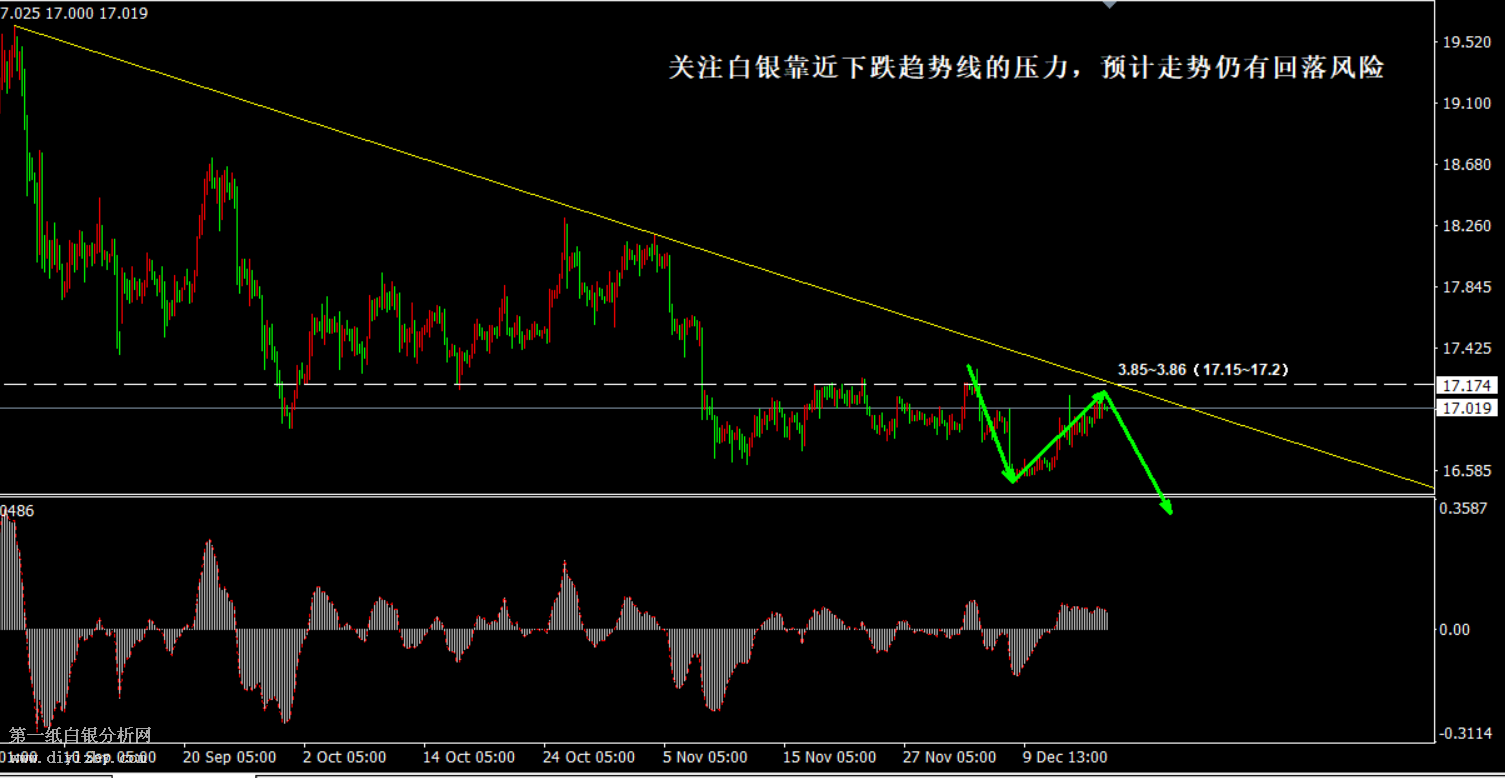今日下方關鍵支3.7(16.5)、3.65(16.3)、3.63(16.2)。今日上方關鍵阻力3.8(16.95)、3.85~3.86(17.15~17.2)、3.88(17.3)。 提示:技術僅僅是基于概率論和統計學的一種綜合分析手段,絕非預測。所以技術分析是在考慮做好止損的情況下去博取大概率事件,投資不可過于迷信技術分析。(短線操作請一定做好止損,一旦被損,代表分析師基于概率和統計的技術分析不適用于當前行情) 另外,由于紙白銀價格是國際銀價換算而來,而換算過程中涉及到人民幣對美元匯率的變化,即使在國際銀價不變化的情況下,如果人民幣貶值或升值,也會導致紙白銀價格出現變動。因此,我們的分析只采用最新的國際銀價對應的人民幣白銀價格,如與過去分析價格有出入, 投資者應知曉其原因。 1、文中價格為紙白銀價格,括號內為國際銀價,投資者可雙向參考。 2、以上價格為工商銀行買入價,即紙白銀低價。進倉點位要再加點差(各銀行點差不一),出倉則不要。 3、第一紙白銀給出的所有建議僅供投資者參考,不作為下單依據,作者不持有白銀,也不計劃買入。觀點僅供參考,不構成投資建議,風險自擔。 4、北京時間09:00發布此文章。 5、上一交易日白銀價格分析情況:(12月16日)白銀未見止跌企穩信號 近期仍存繼續回落風險