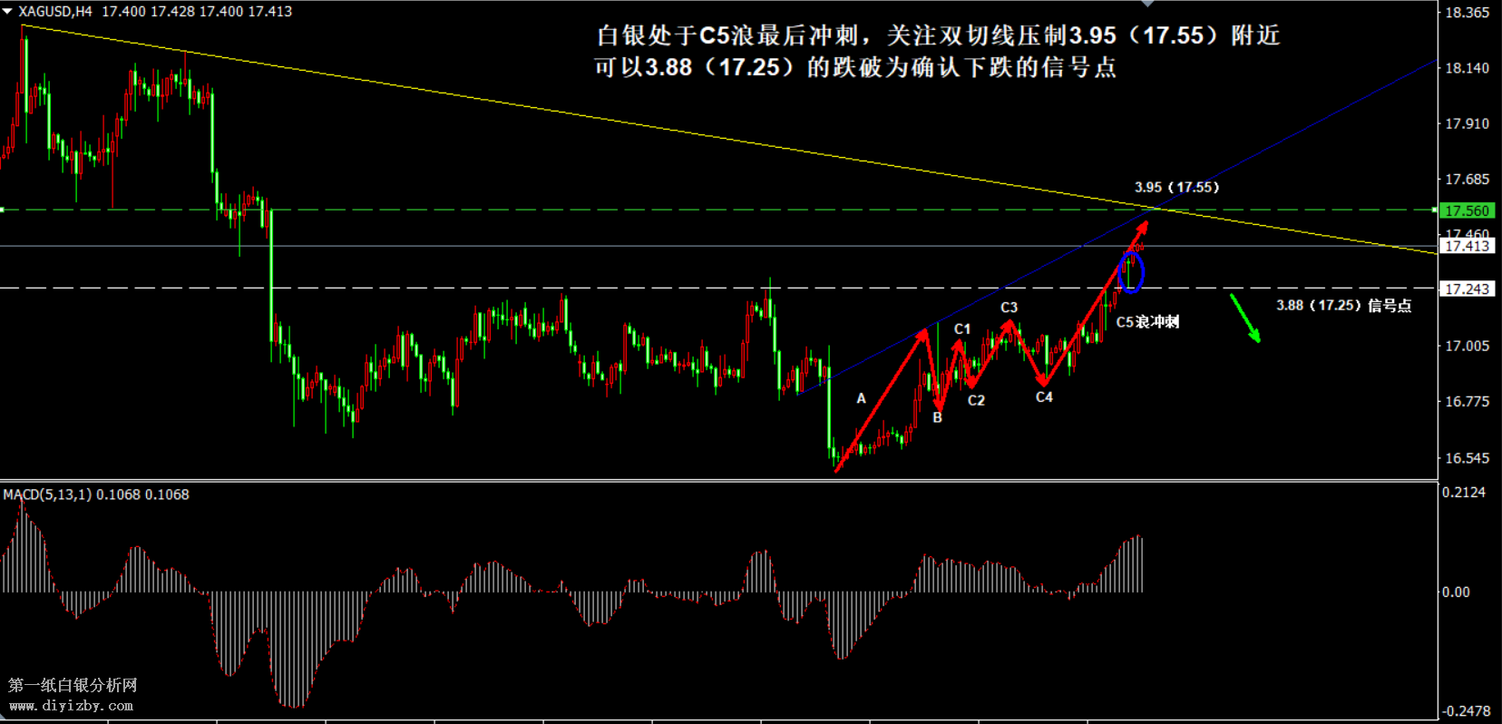 目前白銀價格是3.921元/克(17.414元/盎司)。昨日銀價延續反彈,昨日文中提到,因走勢正處于C5浪的最后沖刺階段,因此走勢仍有上漲空間,目前來看,投資者應該關注上方強阻力3.95(17.55)附近,此處為雙趨勢線匯聚強阻力點位,也是C5浪可能終結的點位,若該點位附近發生大幅回落,且向下跌破3.88(17.25),則可確認反彈行情結束。如下圖所示為白銀4小時周期走勢圖,圖中紅色箭頭顯示,白銀經歷了此前的5浪下跌后,當前正處于ABC浪反彈形態中,且C浪發生了延長,目前走勢正處于C5浪的最后沖刺階段。當C5浪的拉升結束后,行情才有可能向下開啟回落。由于目前白銀的反彈力度較強,日內投資者應繼續采取“條件式”下單策略,圖中黃線和藍線所示分別為雙切線延伸段交匯的壓力位3.95(17.55)附近,注意觀察該點位極其附近的回落情況,投資者可首先保持觀望。昨日銀價在圖中藍色圈內出現快速回落后又迅速拉起,該回落低點3.88(17.25)可視為信號點,當銀價在趨勢線附近受阻后,若能向下跌破此處,則可確認C5浪結束,行情屆時方有望開啟回落。故而,日內投資者可暫時保持觀望,等待銀價向下跌破3.88(17.25)后,反彈在3.9(17.35)上方布局空單,嚴格止損高點3.95(17.55)之上;另外,雖然預判C5浪最后沖刺階段可能出現快速拉升,但由于上方空間已經較少,此時投資者已經不宜再布局多單,謹防行情突然回落風險。值得注意的是,由于目前走勢可能是短期反彈的末尾階段,故而盡管走勢仍有少量上漲空間,但不宜追多,一旦被套則可能是最頂部點位。要注意抓住行情掉頭的時機后再順勢進場,故而以昨日強支撐3.88(17.25)為信號點,當走勢跌破該點位后,投資者再進場布局空單是較為安全的。綜合分析:當前投資者應該采取輕倉策略,同時配合“條件式”下單法,等待銀價完成上圖紅色箭頭上漲,同時向下跌破白線附近的支撐3.88(17.25)后,可反彈布局空單,止損最高點即可,博取走勢向下開啟回落的預期。