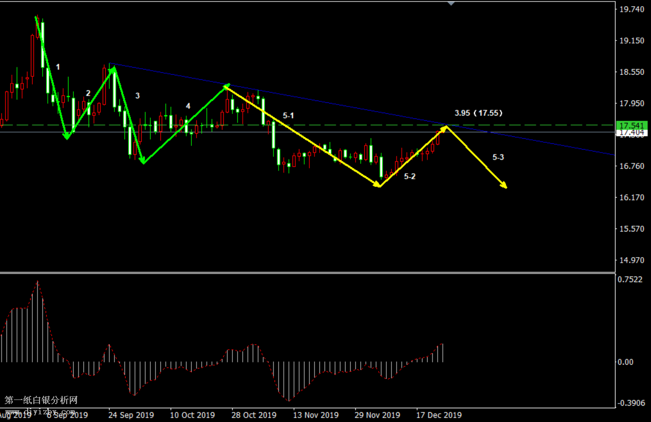 今日下方關鍵支3.77(16.75)、3.71(16.5)、3.66(16.3)、3.64(16.2)。今日上方關鍵阻力3.95(17.55)。 提示:技術僅僅是基于概率論和統計學的一種綜合分析手段,絕非預測。所以技術分析是在考慮做好止損的情況下去博取大概率事件,投資不可過于迷信技術分析。(短線操作請一定做好止損,一旦被損,代表分析師基于概率和統計的技術分析不適用于當前行情) 另外,由于紙白銀價格是國際銀價換算而來,而換算過程中涉及到人民幣對美元匯率的變化,即使在國際銀價不變化的情況下,如果人民幣貶值或升值,也會導致紙白銀價格出現變動。因此,我們的分析只采用最新的國際銀價對應的人民幣白銀價格,如與過去分析價格有出入, 投資者應知曉其原因。 1、文中價格為紙白銀價格,括號內為國際銀價,投資者可雙向參考。 2、以上價格為工商銀行買入價,即紙白銀低價。進倉點位要再加點差(各銀行點差不一),出倉則不要。 3、第一紙白銀給出的所有建議僅供投資者參考,不作為下單依據,作者不持有白銀,也不計劃買入。觀點僅供參考,不構成投資建議,風險自擔。 4、北京時間09:00發布此文章。 5、上一交易日白銀價格分析情況:(12月23日)白銀短線仍有反彈空間 大趨勢看空格局或未變
