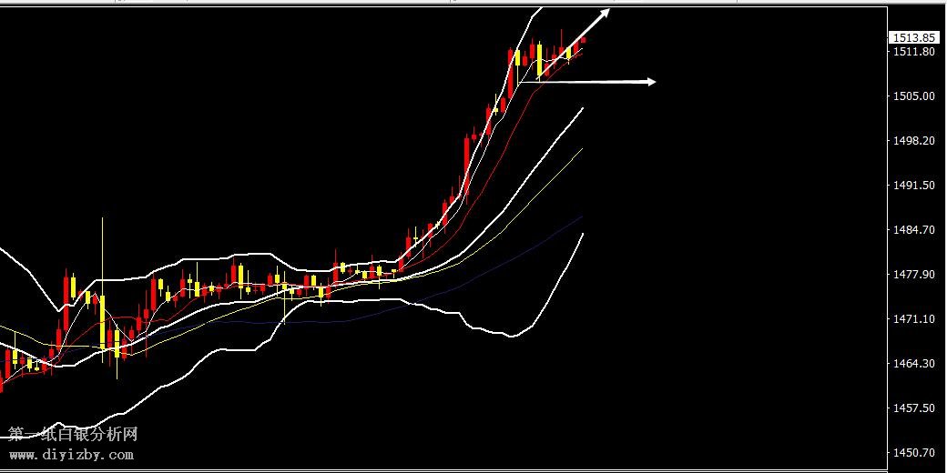 黃金H1走勢圖分析,黃金在上周五午間反彈1513美金承壓 回調,午后歐盤回踩1507美金企穩震蕩反彈,晚間美盤最高反彈觸及1515美金,現價1413美金。小時圖布林帶目前高位整體平行發散運行,今日下方支撐關注1507美金,黃金只要回調不破1506美金就繼續看強勢向上突破,上方繼續看1523 1528美金。黃金若沖高回落,跌破1506美金,那么后面還將高位震蕩調整。今日黃金整體操作思路依然維持做多看漲,順勢操作,把握利潤。