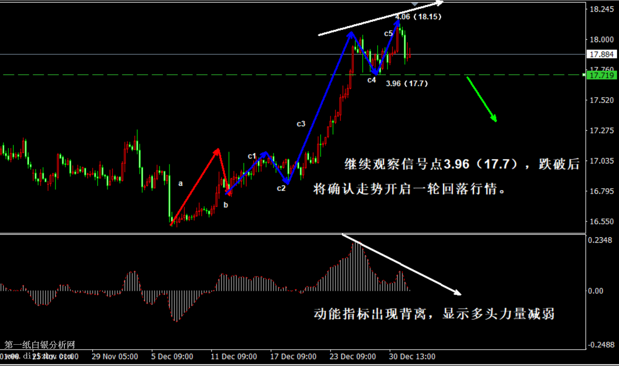 今日下方關(guān)鍵支3.96(17.7)、3.91(17.5)、3.87(17.3)、3.82(17.1)、3.78(16.9)。今日上方關(guān)鍵阻力4.06(18.15)、4.09(18.3)、4.12(18.45)。 提示:技術(shù)僅僅是基于概率論和統(tǒng)計(jì)學(xué)的一種綜合分析手段,絕非預(yù)測(cè)。所以技術(shù)分析是在考慮做好止損的情況下去博取大概率事件,投資不可過(guò)于迷信技術(shù)分析。(短線操作請(qǐng)一定做好止損,一旦被損,代表分析師基于概率和統(tǒng)計(jì)的技術(shù)分析不適用于當(dāng)前行情) 另外,由于紙白銀價(jià)格是國(guó)際銀價(jià)換算而來(lái),而換算過(guò)程中涉及到人民幣對(duì)美元匯率的變化,即使在國(guó)際銀價(jià)不變化的情況下,如果人民幣貶值或升值,也會(huì)導(dǎo)致紙白銀價(jià)格出現(xiàn)變動(dòng)。因此,我們的分析只采用最新的國(guó)際銀價(jià)對(duì)應(yīng)的人民幣白銀價(jià)格,如與過(guò)去分析價(jià)格有出入, 投資者應(yīng)知曉其原因。 1、文中價(jià)格為紙白銀價(jià)格,括號(hào)內(nèi)為國(guó)際銀價(jià),投資者可雙向參考。 2、以上價(jià)格為工商銀行買(mǎi)入價(jià),即紙白銀低價(jià)。進(jìn)倉(cāng)點(diǎn)位要再加點(diǎn)差(各銀行點(diǎn)差不一),出倉(cāng)則不要。 3、第一紙白銀給出的所有建議僅供投資者參考,不作為下單依據(jù),作者不持有白銀,也不計(jì)劃買(mǎi)入。觀點(diǎn)僅供參考,不構(gòu)成投資建議,風(fēng)險(xiǎn)自擔(dān)。 4、北京時(shí)間09:00發(fā)布此文章。 5、上一交易日白銀價(jià)格分析情況:(12月31日)白銀C浪反彈還未結(jié)束 依靠"信號(hào)點(diǎn)"指引方向