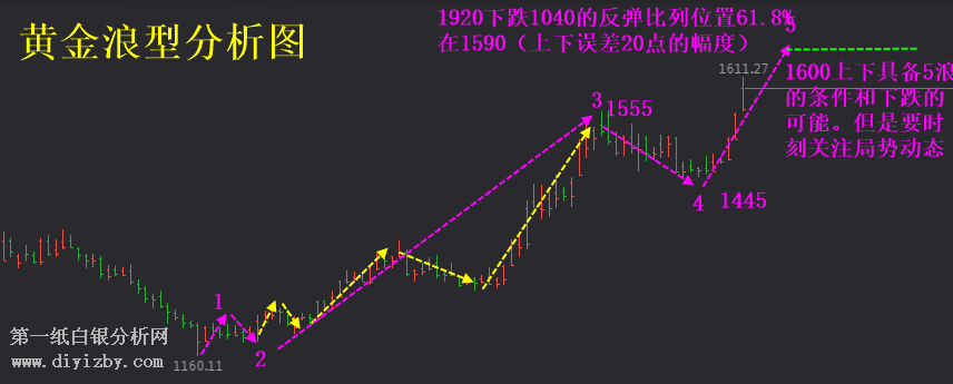 1:黃金1920下跌1040的反彈,61.8%的壓力在1590上下,1600上下具備下跌的可能和情況!因此需要保留5浪之后的ABC下跌調整思路。