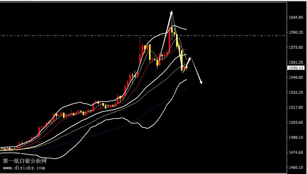 黃金日線走勢圖分析,日線前期連陽上漲,整體依托其MA5均線支撐不斷向上尋求突破,最高反彈觸及1611美金新高承壓回落,隔夜美盤黃金跌破1570美金加速下跌,最低下跌觸及1552美金,日線已經跌破其MA5均線支撐,今日黃金下方關注其日線MA10均線支撐,若再次跌破10均線那么黃金還將向下回調,進一步看其布林中軌1530美金附近。日線走勢圖黃金本來自1446美金企穩震蕩上漲,整體漲幅接近165美金,是該調整的時候了,調整到位后面還有上漲。