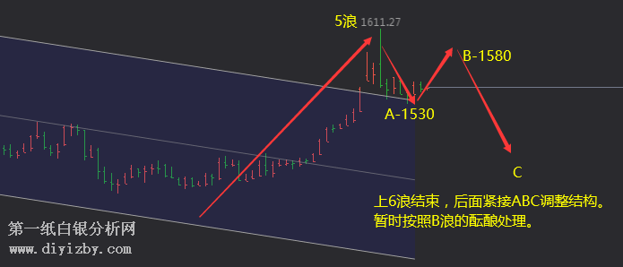 綜上所述,就是小周期震蕩向上修正,12小時看漲回升,日K看時間換空間修正。走勢上就是醞釀次高點的走勢,也就是構(gòu)造結(jié)構(gòu)上的B浪高點。B浪的區(qū)間是1570-1590這里。