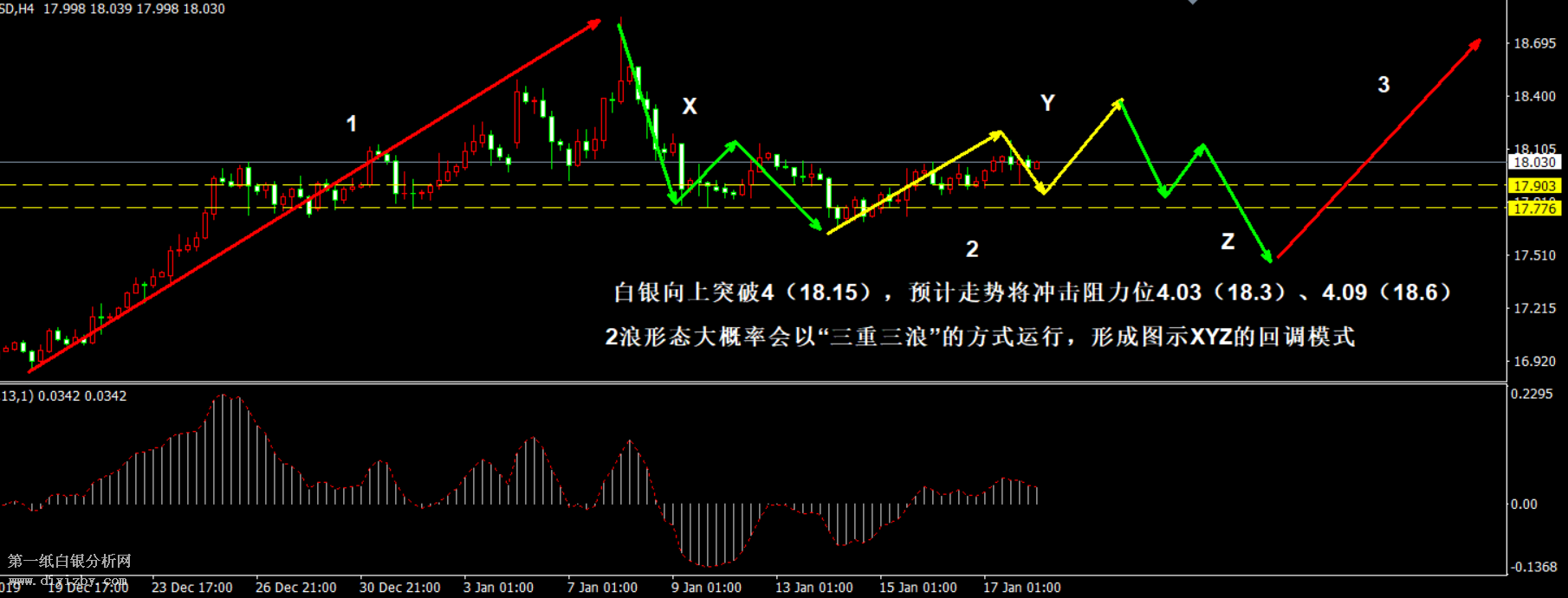 目前白銀價格是3.974元/克(18.025元/盎司)。上周五銀價小幅沖高,向上微破了分水嶺4(18.15)的壓力位,暗示短線走勢仍有向上沖擊更強阻力的預期,2浪調整形態預計以更為復雜的“三重三浪”模式運行,短線走勢將首先向上考驗強壓力,投資者可密切關注阻力位4.03(18.3)、4.09(18.6)兩線的沖擊,短線可嘗試回落繼續加倉做多,在上述阻力位附近獲利離場。如下圖所示為白銀4小時周期走勢圖,圖中左側紅色箭頭所示的連續上漲為主趨勢的第1浪漲勢,目前走勢正處于黃綠箭頭所示的2浪回調修復之中,由于此前回調幅度和形態均未完全修復完畢,而近期走勢又向上突破了4(18.15)的短期分水嶺,這暗示行情短線將繼續向上沖擊更強阻力,形態上有望形成圖中黃綠箭頭所示的“XYZ”模式,即XYZ將均以三浪的模式運行,稱之為三重三浪式調整,這在過去調整行情中經常遇見。即對于當前白銀的觀點如下:短期走勢仍有向上沖擊更高阻力4.03(18.3)、4.09(18.6)的預期,由此形成“次高點”Y浪,而后并不排除走勢再度回落向下考驗更強支撐位,形成Z浪。最終走勢若如期走出上圖XYZ形態后,行情再度企穩后,技術形態上將十分確認行情回調完畢,屆時走勢將向上開啟第3浪拉升的可能性極大。近期投資者仍可順勢布局多單,可嘗試回落在3.91~3.94(17.75~17.9)重點加倉多單,目標看至4.03(18.3)、4.09(18.6)遇阻后離場。另外,仍然保留部分倉位,在低位強支撐3.83(17.4)、3.76(17.05)分批埋伏多單,為Z浪回調做好準備。值得注意的是,當前白銀的主趨勢以上漲為主,即紅色箭頭所示的拉升為主要趨勢,而綠色箭頭所示的下跌僅僅為次級回調趨勢。當回調行情運行完畢后,走勢將有再度向上創出新高的預期,故而建議投資者采取順勢、分批布局多單的策略為主。在此輪2浪回調過程中,是投資者為下一輪拉升布局多單的良好機會。綜合分析:經歷了此前的大1浪上漲后,走勢至少向下回調3浪形態。白銀僅僅以圖示X浪所示的單重三浪模式結束回調的可能性較低,此模式回調幅度和形態上均欠佳。推測走勢仍有運行XYZ模式三重三浪的預期。而后行情完全調整完畢后,將向上開啟主趨勢的第3浪浪拉升。