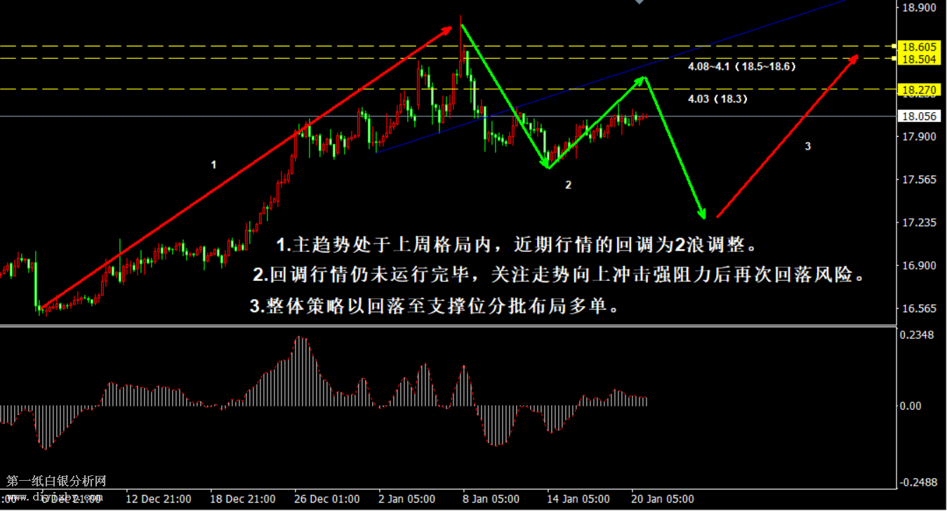 今日下方關鍵支3.9(17.65)、3.83(17.4)、3.76(17.05)。今日上方關鍵阻力4.03(18.3)、4.09(18.6)、4.16(18.9)、4.33(19.6)。 提示:技術僅僅是基于概率論和統(tǒng)計學的一種綜合分析手段,絕非預測。所以技術分析是在考慮做好止損的情況下去博取大概率事件,投資不可過于迷信技術分析。(短線操作請一定做好止損,一旦被損,代表分析師基于概率和統(tǒng)計的技術分析不適用于當前行情) 另外,由于紙白銀價格是國際銀價換算而來,而換算過程中涉及到人民幣對美元匯率的變化,即使在國際銀價不變化的情況下,如果人民幣貶值或升值,也會導致紙白銀價格出現(xiàn)變動。因此,我們的分析只采用最新的國際銀價對應的人民幣白銀價格,如與過去分析價格有出入, 投資者應知曉其原因。 1、文中價格為紙白銀價格,括號內(nèi)為國際銀價,投資者可雙向參考。 2、以上價格為工商銀行買入價,即紙白銀低價。進倉點位要再加點差(各銀行點差不一),出倉則不要。 3、第一紙白銀給出的所有建議僅供投資者參考,不作為下單依據(jù),作者不持有白銀,也不計劃買入。觀點僅供參考,不構(gòu)成投資建議,風險自擔。 4、北京時間09:00發(fā)布此文章。 5、上一交易日白銀價格分析情況:(1月20日)白銀短線有望小幅反彈 但2浪回調(diào)或未完全結(jié)束