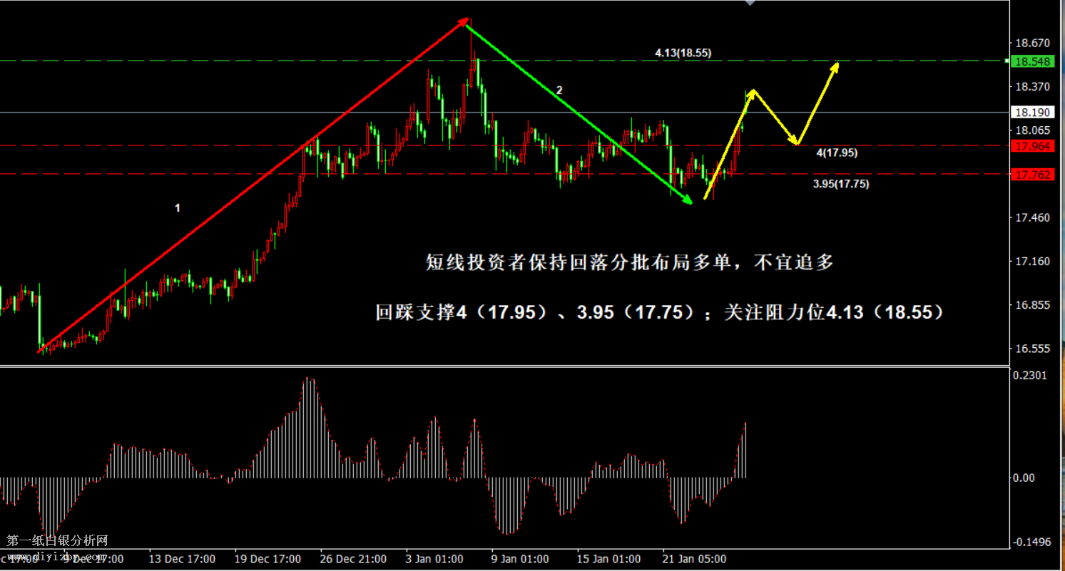 目前白銀價格是4.056元/克(17.188元/盎司)。上周五銀價觸底反彈,受到4小時周期底背離的影響,短期空頭力量發生衰竭,加之市場消息刺激,銀價快速走高。目前投資者可仍于白銀回落中分批布局多單,其中可在支撐位4(17.95)、3.95(17.75)進行多單補倉,目標看至上方強壓力4.13(18.55)附近。如下圖所示為白銀4小時走勢圖,此前我們曾說明,當前白銀的主趨勢處于上漲格局之中,過去一輪第2浪回調是投資者分批布局多單的良好機會。目前銀價向上突破分水嶺4.04(18.15),暗示走勢短期內在回踩后仍有向上沖擊4.13(18.55)阻力的預期,即行情將走出圖中黃色箭頭所示的反彈形態。結合大的局勢分析:1.近期的反彈開始將有可能是新一輪第3浪的初始階段,即走勢已經完成了圖中綠色箭頭所示的2浪回調,開始順應主趨勢展開新一輪第3浪拉升;2.另一種推測,當前走勢亦有可能是“XYZ”浪回調中的Y浪反彈(此因素是考慮到黃金回調并不充分的原因,后市若金價開始調整,白銀受到黃金影響,仍有可能走出Z浪形態的回落),即后市還有Z浪回踩向下考驗3.8(17.05)附近的可能性,屆時走勢將完全回調結束。無論是哪種情況發生,短期內預計行情將首先向上沖擊4.13(18.55)的可能性較大,投資者依舊保持順勢分批布局多單的策略,可在近期行情向下回落至4(17.95)、3.95(17.75)分批加倉多單,目標看至4.13(18.55)附近可獲利離場。綜合近期走勢形態,建議投資者繼續保持分批布局多單的策略,部分倉位可在4(17.95)、3.95(17.75)加倉多單,博取短線行情沖擊4.13(18.55)后獲利離場;部分倉位保留在支撐位3.88(17.4)、3.8(17.05)補倉多單,為第3浪拉升再創新高奠定基礎。無論如何,當前局勢應仍以順勢、分批做多的策略為主,以網格式的進場方式最佳。綜合分析:短期內白銀拉升后上方將面臨諸多阻力,此時投資者不宜追多,建議保持回調中分批補倉多單的方式。當前格局只要保持順勢操作思路,則投資者仍具備較大的盈利機會和較低的風險。