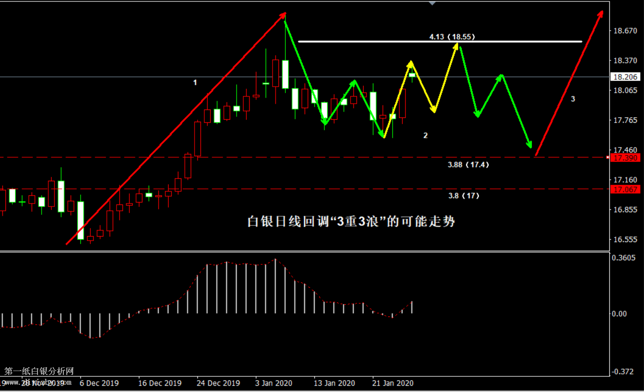 白銀短線策略:(主趨勢看漲,回調中分批布局多單)。 從日線走勢形態分析,白銀2浪回調仍有可能以“3重3浪”的方式完成調整,這是后市白銀走勢的可能運行形態之一。如下圖所示為白銀日線走勢圖,圖中左側紅色箭頭所示為主趨勢1浪拉升,目前行情正處于2浪回調節奏之中,當2浪回調完全結束后,走勢將向上展開新一輪第3浪拉升形態。目前2浪回調仍有可能以圖中黃綠箭頭交替的方式運行“3重3浪”調整,這是2浪調整的經典模式,在過去統計形態中屢屢發生。加之當前黃金價格調整并不充分,若后市金價發生回調,則并不排除白銀走出仍存形態的可能性。目前銀價正運行在圖中黃色箭頭的反彈之中,短期內回落后應關注阻力位4.13(18.55)附近的再次沖擊。