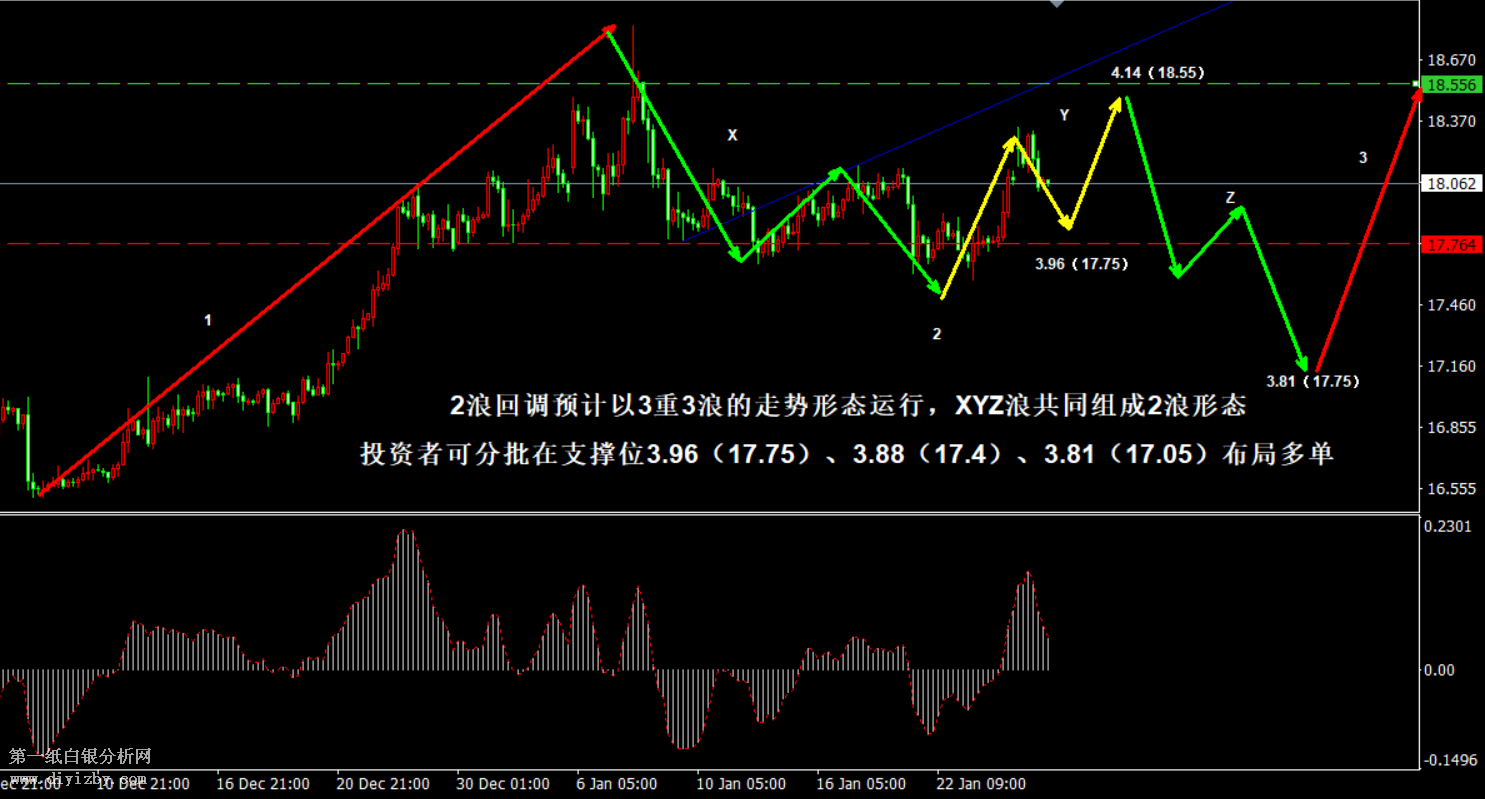 目前白銀價格是4.036元/克(18.065元/盎司)。昨日銀價沖高回落,短期內(nèi)第3浪主趨勢的拉升預計還未開始,走勢近期仍具備向下回踩支撐的預期,投資者可保持在支撐位分批布局多單,短線可博取Y浪反彈沖擊4.14(18.55)附近,中線則耐心等待主趨勢的第3浪上漲的出現(xiàn)。如下圖所示為白銀4小時周期走勢圖,圖中黃綠箭頭的走勢形態(tài)可統(tǒng)一定義為2浪回調(diào),預計2浪調(diào)整將以“三重三浪”的方式運行的可能性較大,即2浪回調(diào)由圖中XYZ三大浪組合而成,稱之為三重浪;而三重浪內(nèi)再次由三大浪組合,故而總稱之為“三重三浪”。這在過去的2浪回調(diào)中屢次出現(xiàn),根據(jù)近期走勢形態(tài)推測,銀價仍有可能采取上述運行方式波動。但無論如何波動,白銀的主趨勢以看漲格局為主,即圖中左側(cè)紅色箭頭所示為白銀主趨勢的第1浪上漲,近期黃綠箭頭所構(gòu)成的回落則是第2浪回調(diào),當所有回調(diào)結(jié)束后,走勢將向上展開右側(cè)紅色箭頭所示的一輪第3浪拉升。為了防止2浪回調(diào)內(nèi)部結(jié)構(gòu)發(fā)生變形,投資者只需采取順勢、分批布局多單的方式進場即可。日內(nèi)投資者可在Y浪支撐位3.96(17.75)附近補倉多單,同時在Z浪低位支撐3.88(17.4)、3.81(17.05)附近分批埋伏多單,短期目標看至阻力4.14(18.55),中期目標則看至1浪高點4.22(18.9)被突破。值得注意的是,無論圖示XYZ浪內(nèi)部結(jié)構(gòu)如何改變,最終投資者應該重點關注的支撐位是3.96(17.75)、3.88(17.4)、3.81(17.05),上述點位具備較強的買盤支撐,投資者可分批在上述位置布局多單。同時可重點關注后市銀價在3.81(17.05)附近完全止跌企穩(wěn)的可能性,根據(jù)XZ浪等距原則以及三重三浪結(jié)構(gòu)支撐,該點位將有較大可能性成為銀價2浪回調(diào)的終點位置。綜合分析:預計白銀短線并不會直接啟動第3浪拉升,投資者不宜追多,仍然保持回調(diào)中分批布局多單為主。近期行情若回踩支撐再次向上沖擊阻力,則注意關注4.14(18.55)附近獲利離場;2浪回調(diào)的終點位置,則重點關注3.81(17.05)附近的強支撐位。