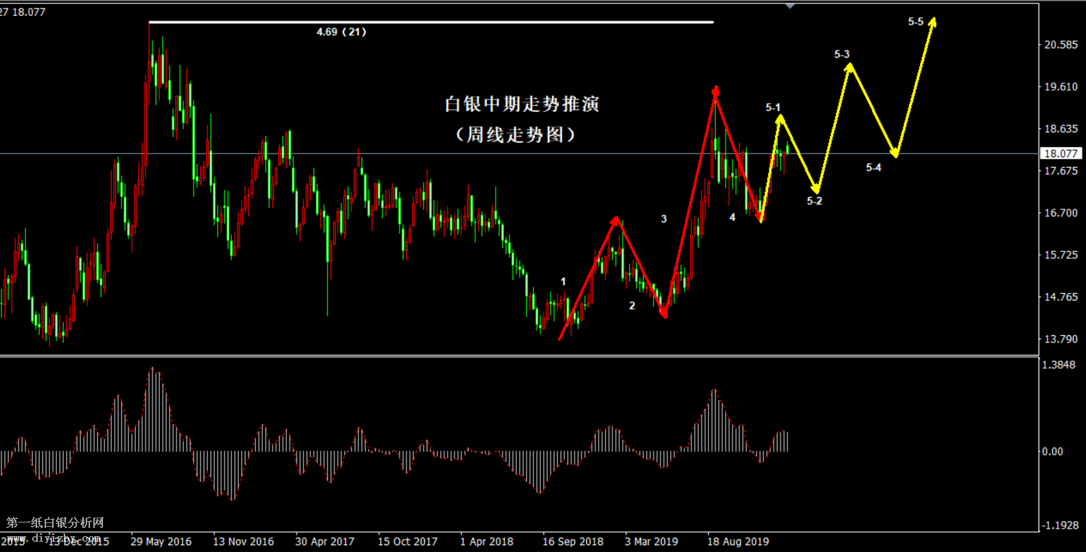 白銀短線策略:(主趨勢看漲,回調(diào)中分批布局多單)。 2020年白銀中期走勢仍以看漲為主,并具備較大的上漲空間。如下圖所示為白銀周線走勢圖,根據(jù)形態(tài)對2020年中期走勢進行推演,圖中紅色箭頭所示為中期上漲的主趨勢,目前走勢已經(jīng)完成了主趨勢1~4浪的全部運行。當前銀價正處于圖中黃色箭頭所示的5-2浪回調(diào)內(nèi)運行,在1~4浪均未發(fā)生延長的情況下,5浪往往都會延長運行。即圖示的第5浪上漲預計將再以5個小浪的模式組合而成,當近期的回調(diào)結(jié)束后,中期走勢將展開5-3浪的拉升。當圖中黃色箭頭所示的全部5-5浪上漲結(jié)束后,走勢預計將突破近幾年高點的4.69(21)關口(這個時期預計在2020~2021年內(nèi)完成)。