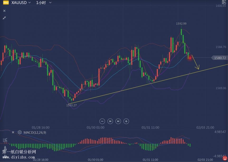 雖然,小范圍的跳空高開1592附近,回落后破位了起漲點1587,也就意味著今天要反轉的概率大幅降低,最起碼歐盤就有一定的難度,目前1584成為了下午關注的重點,這個位置的反彈能否越位,決定著探底是否回落,不能因為上周的上漲,就盲目認為今天應該漲,這是很片面的看法。