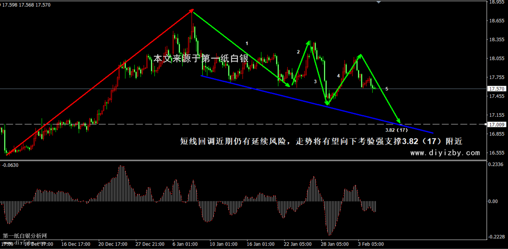今日下方關(guān)鍵支3.89(17.3)、3.82(17)。今日上方關(guān)鍵阻力4.07(18.1)、4.13(18.35)。 提示:技術(shù)僅僅是基于概率論和統(tǒng)計(jì)學(xué)的一種綜合分析手段,絕非預(yù)測(cè)。所以技術(shù)分析是在考慮做好止損的情況下去博取大概率事件,投資不可過(guò)于迷信技術(shù)分析。(短線操作請(qǐng)一定做好止損,一旦被損,代表分析師基于概率和統(tǒng)計(jì)的技術(shù)分析不適用于當(dāng)前行情) 另外,由于紙白銀價(jià)格是國(guó)際銀價(jià)換算而來(lái),而換算過(guò)程中涉及到人民幣對(duì)美元匯率的變化,即使在國(guó)際銀價(jià)不變化的情況下,如果人民幣貶值或升值,也會(huì)導(dǎo)致紙白銀價(jià)格出現(xiàn)變動(dòng)。因此,我們的分析只采用最新的國(guó)際銀價(jià)對(duì)應(yīng)的人民幣白銀價(jià)格,如與過(guò)去分析價(jià)格有出入, 投資者應(yīng)知曉其原因。 1、文中價(jià)格為紙白銀價(jià)格,括號(hào)內(nèi)為國(guó)際銀價(jià),投資者可雙向參考。 2、以上價(jià)格為工商銀行買入價(jià),即紙白銀低價(jià)。進(jìn)倉(cāng)點(diǎn)位要再加點(diǎn)差(各銀行點(diǎn)差不一),出倉(cāng)則不要。 3、第一紙白銀給出的所有建議僅供投資者參考,不作為下單依據(jù),作者不持有白銀,也不計(jì)劃買入。觀點(diǎn)僅供參考,不構(gòu)成投資建議,風(fēng)險(xiǎn)自擔(dān)。 4、北京時(shí)間09:00發(fā)布此文章。 5、上一交易日白銀價(jià)格分析情況:(2月4日)白銀通道上沿沖高回落 短線回調(diào)行情仍在延續(xù)