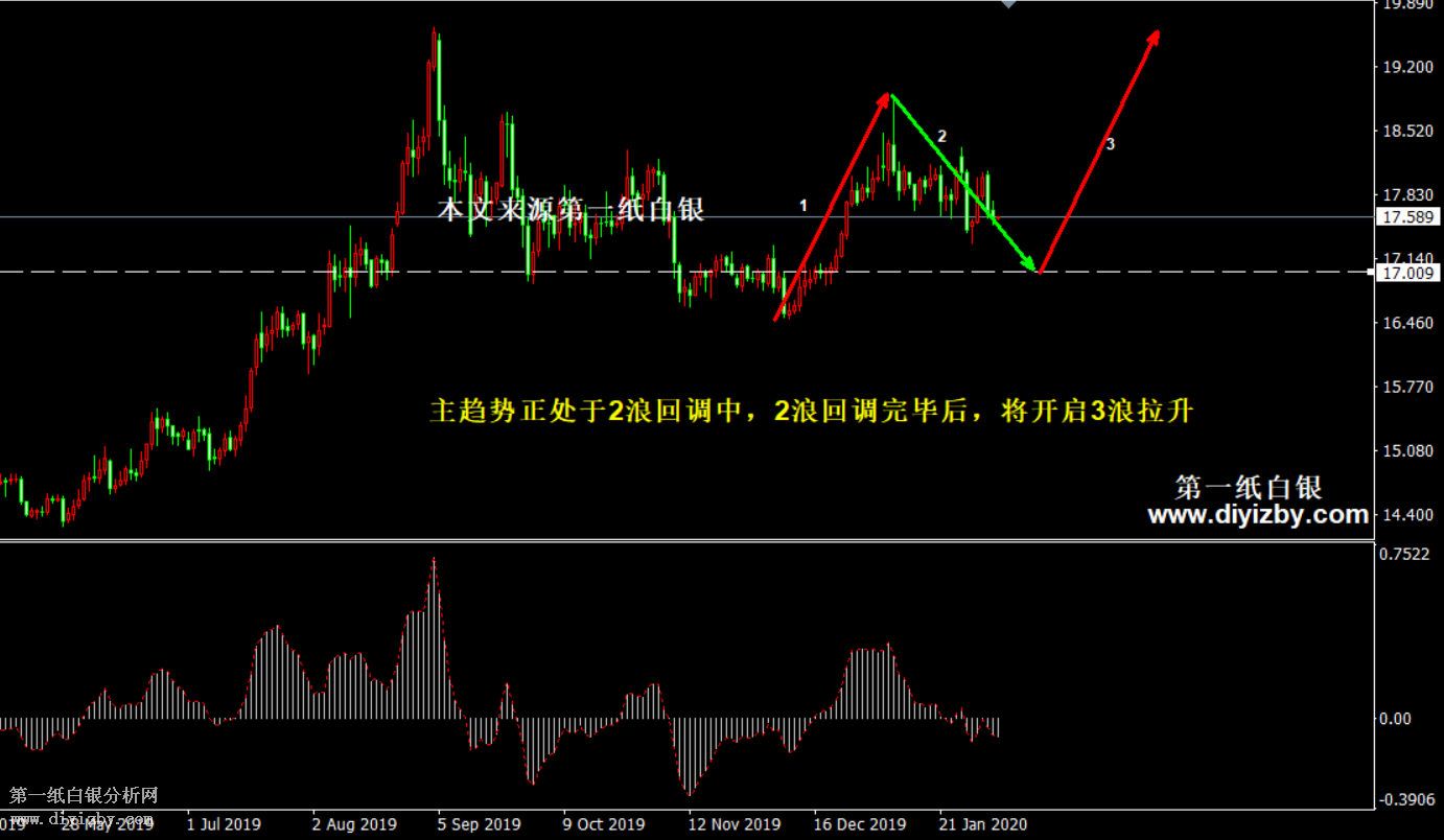 白銀短線策略:(主趨勢(shì)看漲,短線處于回調(diào)中)。 從大趨勢(shì)分析,白銀近期1個(gè)月的回落則全部隸屬于2浪回調(diào)形態(tài),當(dāng)2浪回調(diào)完全運(yùn)行完畢后,走勢(shì)將向上開(kāi)啟新一輪第3浪的主趨勢(shì)拉升。如下圖所示為白銀日線走勢(shì)圖,圖中紅綠箭頭所示為大趨勢(shì)的運(yùn)行節(jié)奏,盡管近期走勢(shì)預(yù)計(jì)將延續(xù)回調(diào),但此次回調(diào)并非趨勢(shì)性下跌,是一次回踩驗(yàn)證行情。此前走勢(shì)在一輪1浪上漲結(jié)束后,目前白銀將向下進(jìn)行回踩驗(yàn)證,可視為綠色箭頭所示的2浪回調(diào)。待2浪回調(diào)運(yùn)行完畢后,走勢(shì)預(yù)計(jì)將向上開(kāi)啟新一輪的第3浪拉升。因此,目前主趨勢(shì)看漲的背景下,投資者可注意行情回踩強(qiáng)支撐附近布局多單,為下一輪大趨勢(shì)看漲奠定基礎(chǔ)。