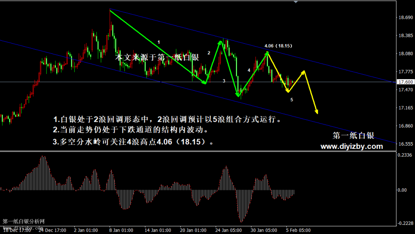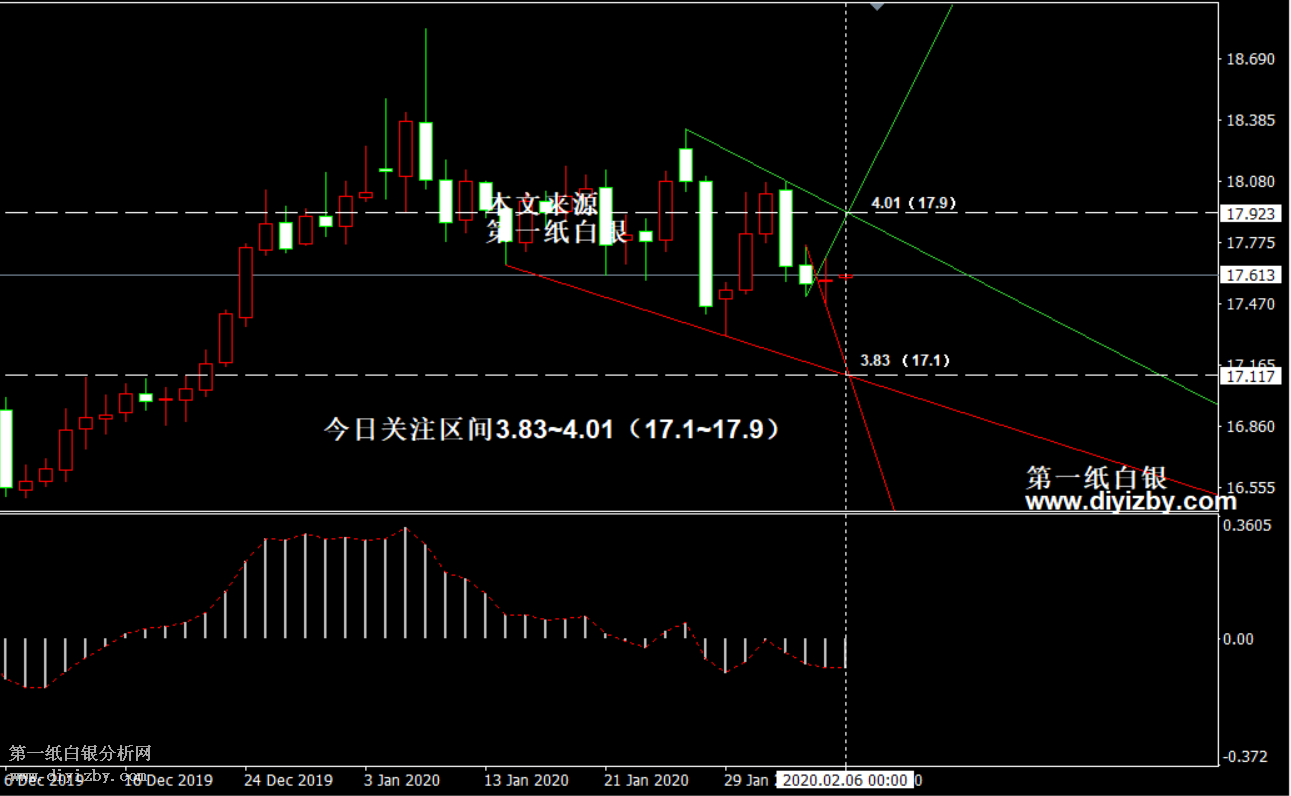 今日下方關鍵支3.87(17.3)、3.81(17)。今日上方關鍵阻力4.06(18.15)、4.11(18.35)。 提示:技術僅僅是基于概率論和統計學的一種綜合分析手段,絕非預測。所以技術分析是在考慮做好止損的情況下去博取大概率事件,投資不可過于迷信技術分析。(短線操作請一定做好止損,一旦被損,代表分析師基于概率和統計的技術分析不適用于當前行情) 另外,由于紙白銀價格是國際銀價換算而來,而換算過程中涉及到人民幣對美元匯率的變化,即使在國際銀價不變化的情況下,如果人民幣貶值或升值,也會導致紙白銀價格出現變動。因此,我們的分析只采用最新的國際銀價對應的人民幣白銀價格,如與過去分析價格有出入, 投資者應知曉其原因。 1、文中價格為紙白銀價格,括號內為國際銀價,投資者可雙向參考。 2、以上價格為工商銀行買入價,即紙白銀低價。進倉點位要再加點差(各銀行點差不一),出倉則不要。 3、第一紙白銀給出的所有建議僅供投資者參考,不作為下單依據,作者不持有白銀,也不計劃買入。觀點僅供參考,不構成投資建議,風險自擔。 4、北京時間09:00發布此文章。 5、上一交易日白銀價格分析情況:(2月5日)白銀回調行情未結束 后市關注走勢回踩強支撐