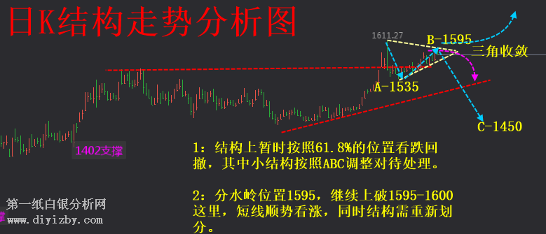 2:趨勢的結構上,目前的C浪結構下跌趨勢依舊是形成有效,日內可依托1575附近的壓力進行沽涳布局看跌回撤!