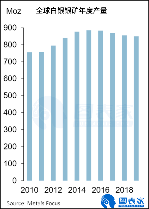 根據MetalsFocus的數據,2019年全球銀礦產量可能下降580萬盎司,至8.493億盎司,下降0.7%。這標志著全球經濟連續第四年萎縮。