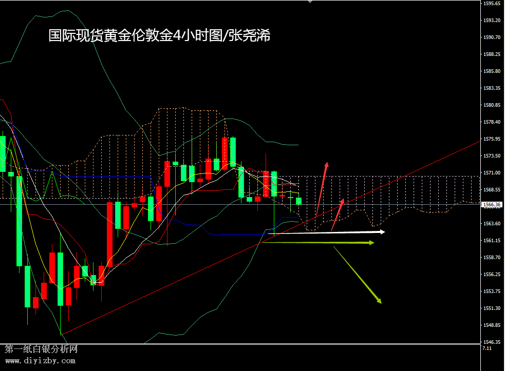 日線級(jí)別;金價(jià)也在昨日說道的周一震蕩十字,說明上方壓力較強(qiáng),日內(nèi)也將再度轉(zhuǎn)跌,目前走盤得到驗(yàn)證。今日又再度表現(xiàn)承壓。指標(biāo)上,MACD綠色動(dòng)能柱縮減后又有所增強(qiáng),KDJ及RSI指標(biāo)暫處于溫和偏弱狀態(tài),只是看漲云帶完好,和市場情緒上暗示后市仍有延續(xù)性反彈,下方關(guān)注中軌支撐1563-1561美元,初步觸及此可先行看漲,上方關(guān)注1569-1571美元?jiǎng)t再度看空,如日收線于此上方則低多為主。