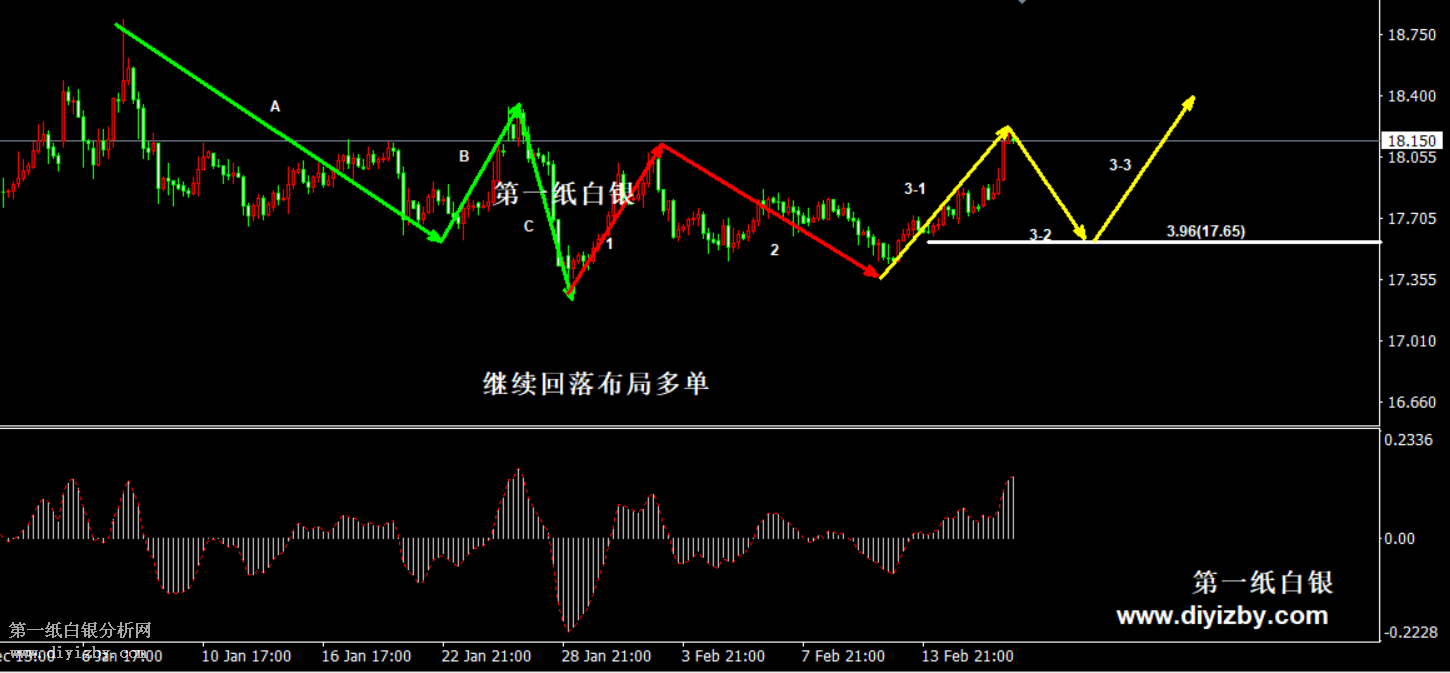 今日下方關鍵支4(17.8)、3.96(17.65)。今日上方關鍵阻力4.09(18.2)、4.15(18.5)。 提示:技術僅僅是基于概率論和統計學的一種綜合分析手段,絕非預測。所以技術分析是在考慮做好止損的情況下去博取大概率事件,投資不可過于迷信技術分析。(短線操作請一定做好止損,一旦被損,代表分析師基于概率和統計的技術分析不適用于當前行情) 另外,由于紙白銀價格是國際銀價換算而來,而換算過程中涉及到人民幣對美元匯率的變化,即使在國際銀價不變化的情況下,如果人民幣貶值或升值,也會導致紙白銀價格出現變動。因此,我們的分析只采用最新的國際銀價對應的人民幣白銀價格,如與過去分析價格有出入, 投資者應知曉其原因。 1、文中價格為紙白銀價格,括號內為國際銀價,投資者可雙向參考。 2、以上價格為工商銀行買入價,即紙白銀低價。進倉點位要再加點差(各銀行點差不一),出倉則不要。 3、第一紙白銀給出的所有建議僅供投資者參考,不作為下單依據,作者不持有白銀,也不計劃買入。觀點僅供參考,不構成投資建議,風險自擔。 4、北京時間09:00發布此文章。 5、上一交易日白銀價格分析情況:(2月18日)白銀短線正面臨方向選擇 密切關注多空分水嶺
