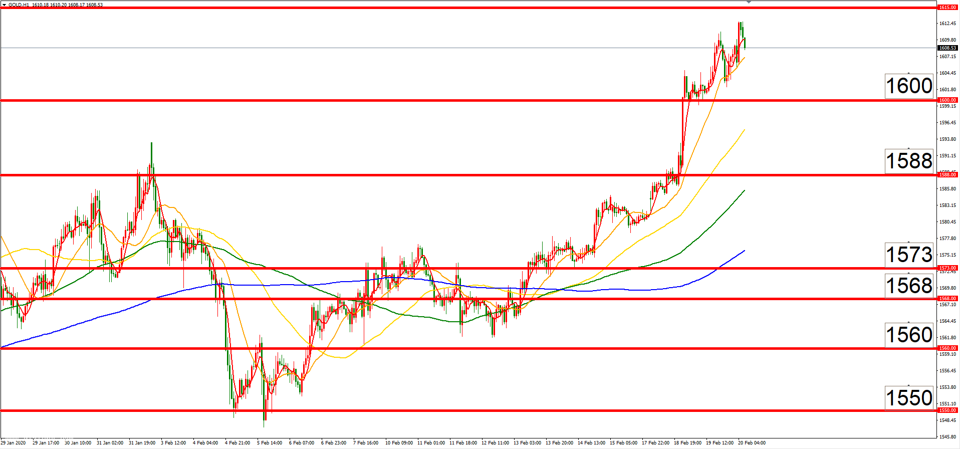 周三(19日)避險情緒的攀升持續(xù)刺激著金價的上漲,主因仍由于疫情對全球經(jīng)濟所帶來的負面影響,使得金價再度創(chuàng)下近期新高價位,最高來到1612美元/盎司。另一方面風險資產(chǎn)也持續(xù)的走高,歐美股市的上漲也意味著市場投資人仍是樂觀看待后市,預期疫情對全球經(jīng)濟的影響將可能是短暫的。后續(xù)須持續(xù)留意風險資產(chǎn)與避險資產(chǎn)的資金動向,勢必會出現(xiàn)強勢的一方,若屆時市場投資人信心持續(xù)回籠,資金回流至風險資產(chǎn),避險資產(chǎn)就要留意價格回落的風險。
