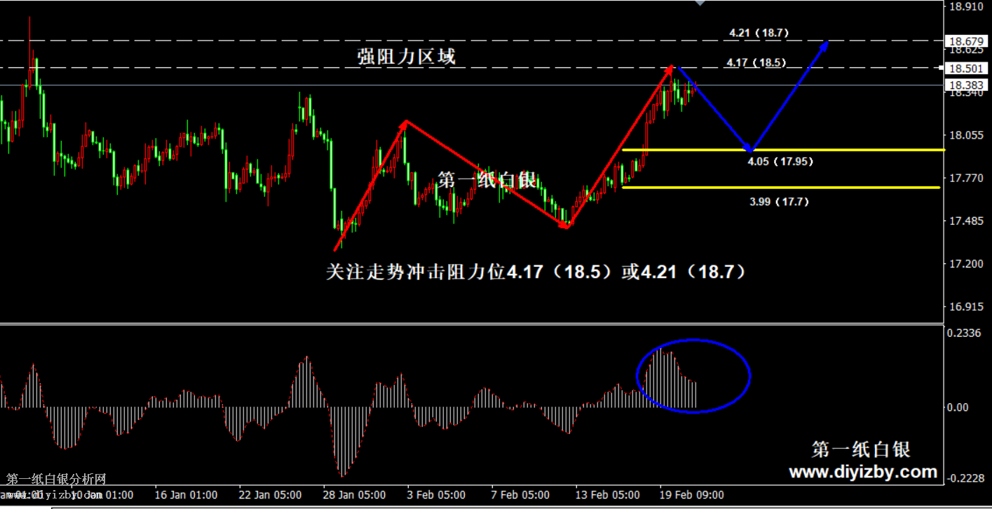 今日下方關鍵支4.03~4.05(17.95~18.05)、3.97~3.98(17.65~17.7)。今日上方關鍵阻力4.16(18.5)。 提示:技術僅僅是基于概率論和統計學的一種綜合分析手段,絕非預測。所以技術分析是在考慮做好止損的情況下去博取大概率事件,投資不可過于迷信技術分析。(短線操作請一定做好止損,一旦被損,代表分析師基于概率和統計的技術分析不適用于當前行情) 另外,由于紙白銀價格是國際銀價換算而來,而換算過程中涉及到人民幣對美元匯率的變化,即使在國際銀價不變化的情況下,如果人民幣貶值或升值,也會導致紙白銀價格出現變動。因此,我們的分析只采用最新的國際銀價對應的人民幣白銀價格,如與過去分析價格有出入, 投資者應知曉其原因。 1、文中價格為紙白銀價格,括號內為國際銀價,投資者可雙向參考。 2、以上價格為工商銀行買入價,即紙白銀低價。進倉點位要再加點差(各銀行點差不一),出倉則不要。 3、第一紙白銀給出的所有建議僅供投資者參考,不作為下單依據,作者不持有白銀,也不計劃買入。觀點僅供參考,不構成投資建議,風險自擔。 4、北京時間09:00發布此文章。 5、上一交易日白銀價格分析情況:(2月20日)白銀主趨勢看漲格局不變 待回調后可分批做多
