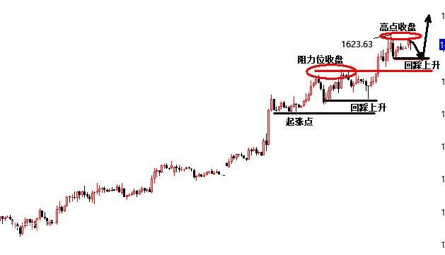 昨日黃金美盤再度強勢上升,坐實了突破1611的形態,也以大陽收盤在1620一線。