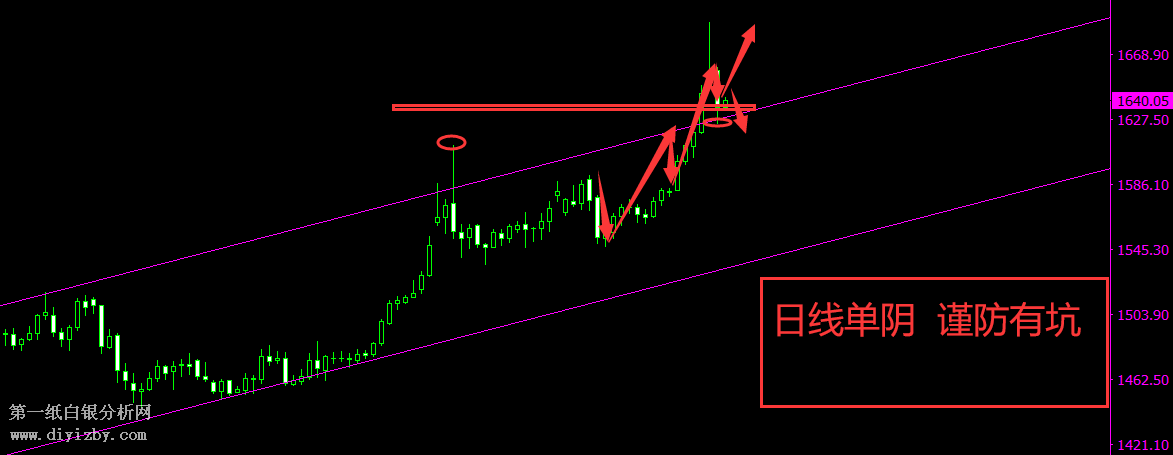 開多一直是本月在堅守執行的事情,昨日黃金我們布局了三張多,早盤的1650多,金價反抽1658提示短線出貨,歐盤1640繼續開多,微利收場,晚間1648續多,1653出貨,最高金價昨晚反彈就在1653附近,隨后凌晨跳水,布局那么多多為的就是等待奇跡出現,而最終多頭讓大家失望了,昨日的趨勢是空頭,僥幸獲勝皆因快進快出,今日布局還是低多,日線單陰,暫時趨勢先看反彈,波段為主。