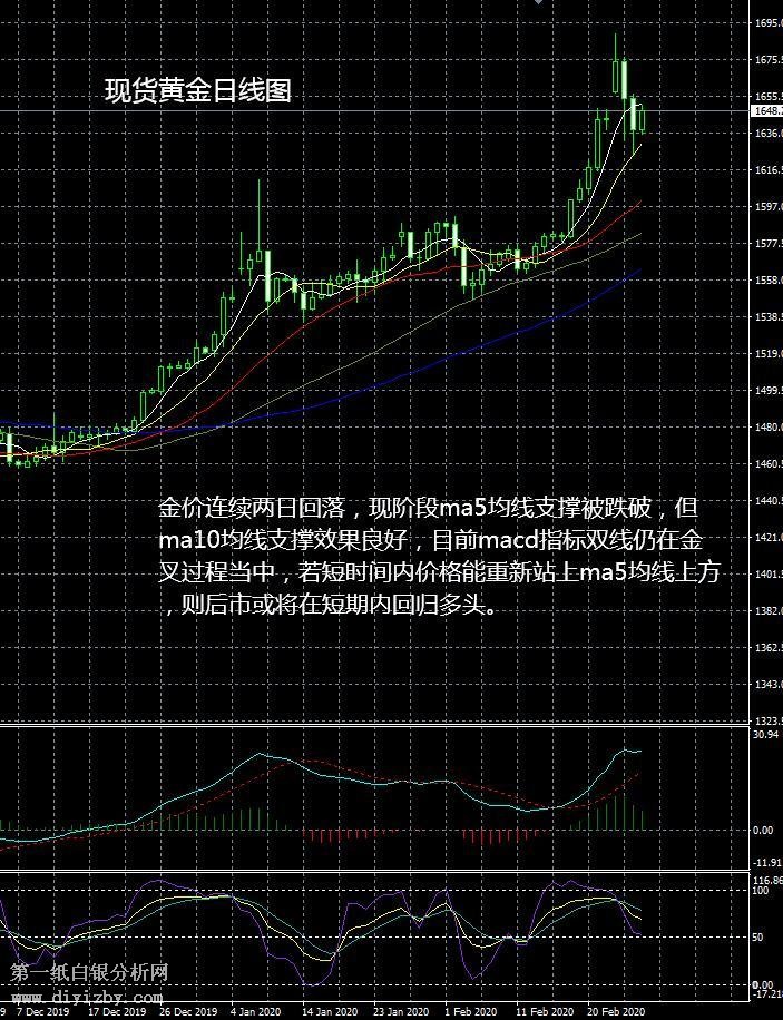 從現貨黃金日線圖看,金價連續兩日回落,現階段ma5均線支撐被跌破,但ma10均線支撐效果良好,目前macd指標雙線仍在金叉過程當中,若短時間內價格能重新站上ma5均線上方,則后市或將在短期內回歸多頭。