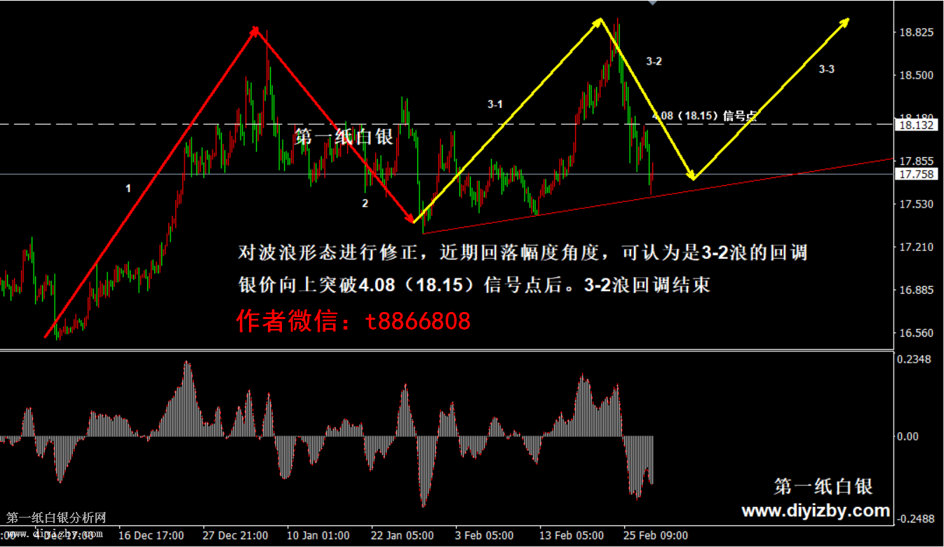 今日下方關鍵支3.96(17.6)。今日上方關鍵阻力4.08(18.15)、4.18(18.6)、4.25(18.9)、4.42(19.6)。 提示:技術僅僅是基于概率論和統計學的一種綜合分析手段,絕非預測。所以技術分析是在考慮做好止損的情況下去博取大概率事件,投資不可過于迷信技術分析。(短線操作請一定做好止損,一旦被損,代表分析師基于概率和統計的技術分析不適用于當前行情) 另外,由于紙白銀價格是國際銀價換算而來,而換算過程中涉及到人民幣對美元匯率的變化,即使在國際銀價不變化的情況下,如果人民幣貶值或升值,也會導致紙白銀價格出現變動。因此,我們的分析只采用最新的國際銀價對應的人民幣白銀價格,如與過去分析價格有出入, 投資者應知曉其原因。 1、文中價格為紙白銀價格,括號內為國際銀價,投資者可雙向參考。 2、以上價格為工商銀行買入價,即紙白銀低價。進倉點位要再加點差(各銀行點差不一),出倉則不要。 3、第一紙白銀給出的所有建議僅供投資者參考,不作為下單依據,作者不持有白銀,也不計劃買入。觀點僅供參考,不構成投資建議,風險自擔。 4、北京時間09:00發布此文章。 5、上一交易日白銀價格分析情況:(2月27日)白銀考驗強支撐買盤力量 關注信號點指引方向