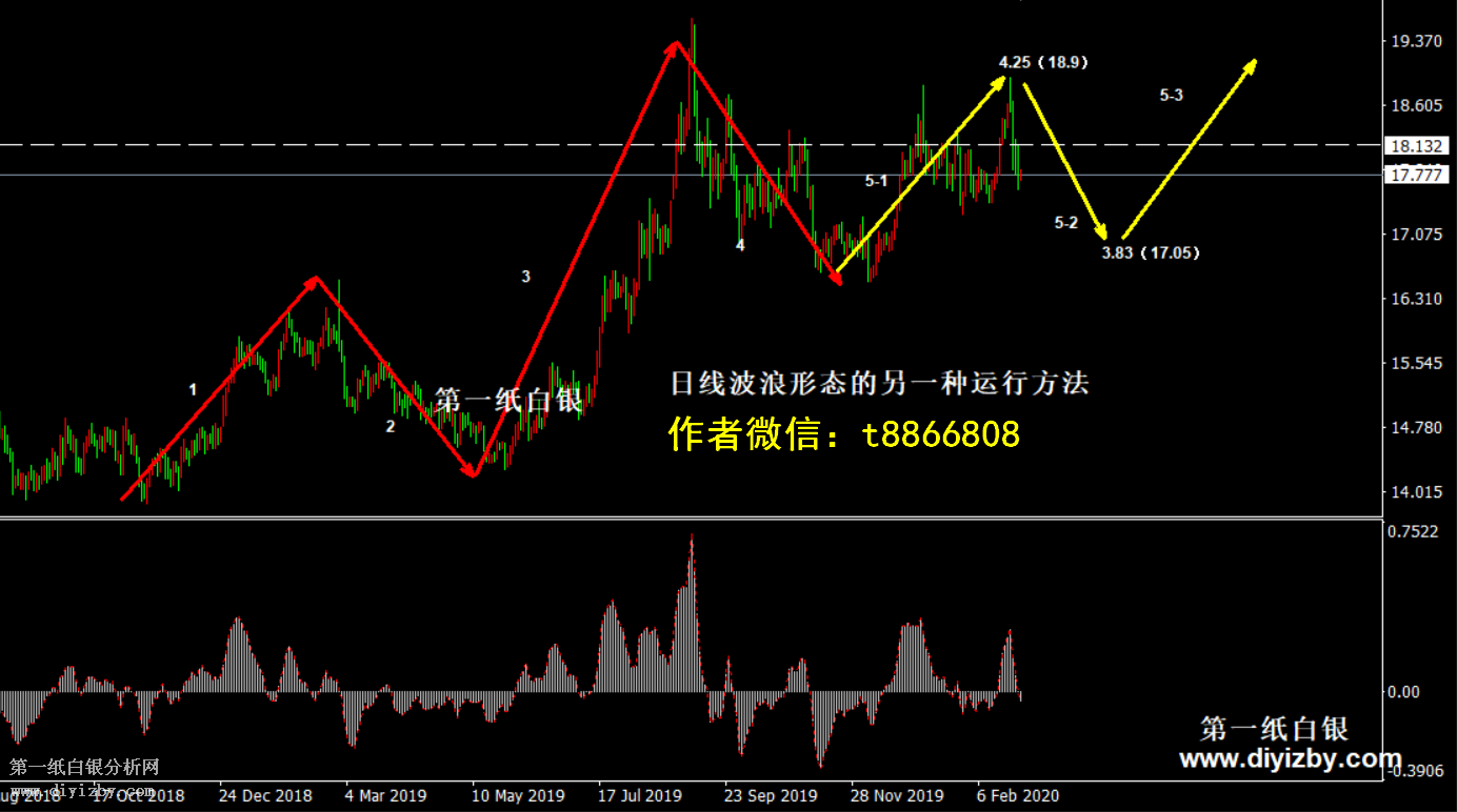 上圖4小時的分析是一種大概率的白銀運行模式。但從日線走勢形態分析,銀價亦具備另一種走法,波浪形態的推演并不是唯一的,其中特別涉及到細分浪結構時,走勢具備多種變化。從日線結構來看,主趨勢處于向上運行結節奏無疑。然而中期1浪和3浪均未發生延長形態,因此5浪發生延長的概率較大。這就涉及到初始階段5-1浪和5-2浪的確認,而后由此推演出5-3、5-4、5-5浪。如圖中黃色箭頭所示,中期走勢還可將過去3個月的整體漲勢確認為5-1浪上漲,而當前走勢正處于5-2浪回調。中期回調的支撐位仍有可能是在3.83(17.05)附近(近期行情無法突破信號點4.08(18.15)的前提下)。雖然此種日線走勢運行概率較低,但仍然是一種可能存在的走法。