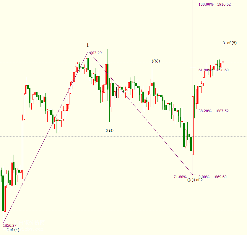 日線上看,現貨黃金自1855美元開啟上行(5)浪走勢。小時圖上看,金價自1870美元開啟上行3浪走勢,并升破61.8%目標位1899美元,并有望進一步上摸100%目標位1916美元。3浪是(5)浪的子浪。