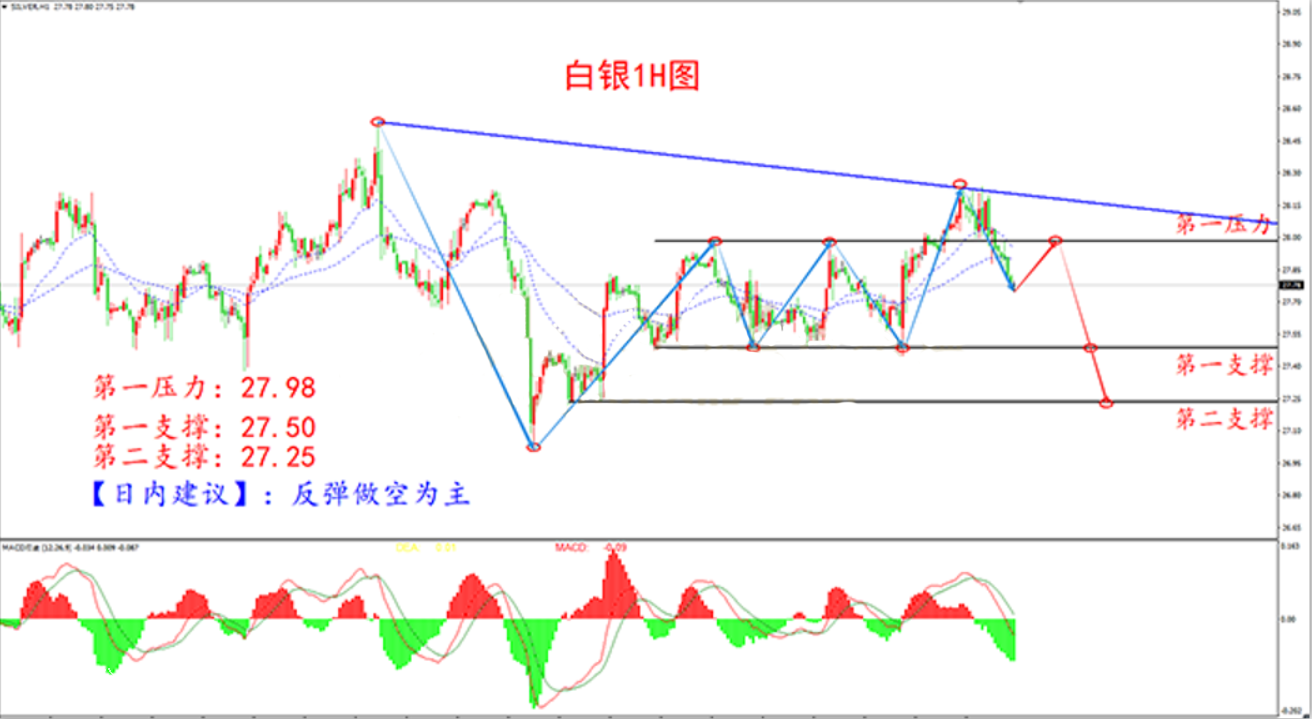 從上圖白銀1H周期走勢(shì)來(lái)看,白銀自28.53周邊下跌,在跌至27.02周邊受到支撐,隨后反彈至27.93周邊受阻,圍繞27.50至27.98振動(dòng)整頓。上周四在沖破區(qū)間上軌壓力后周五再次回到區(qū)間之內(nèi),走出多頭衰竭狀態(tài),證實(shí)反彈行情或已結(jié)束,后市較大概率不斷下跌,操作上可關(guān)注空單機(jī)會(huì)。結(jié)合MACD指標(biāo)來(lái)看,DIFF線(xiàn)與DEA死叉向下,但綠色能量柱在縮小,證實(shí)空頭力量在減弱,短線(xiàn)或有反彈,日內(nèi)操作可在其反彈至27.98周邊嘗試空單。