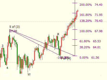 日線上,紐約商品交易所原油從61.56美元開始上行(5)浪走勢,已突破71.95美元的161.8%目標,預計未來將挑戰74.40美元的200%目標。