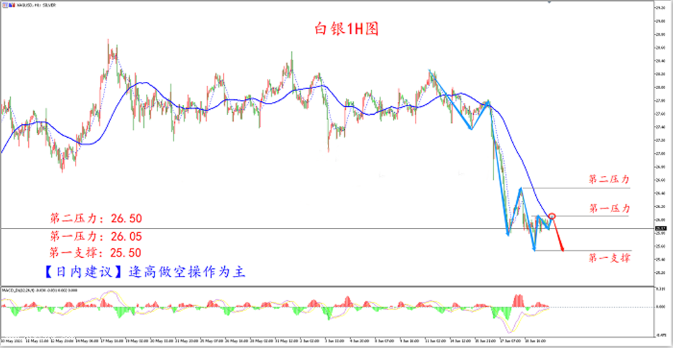 白銀1H圖來看,白銀在快速破位后加速下跌,昨日繼續(xù)創(chuàng)出25.50的新低。開始反彈,反彈至26.05左右,受到壓制。從移動平均指數(shù)看,白銀仍在MA60以下,MA60上線壓制白銀反彈。從MACD指數(shù)來看,K線價格創(chuàng)出新低,但指數(shù)價格并未創(chuàng)出新低。股指偏離低位后開始反彈,但多頭動能柱逐漸減弱,反彈動能出現(xiàn)衰竭跡象。建議投資者可以考慮每天高點做空的想法。