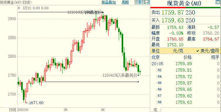 本月初,金價再次站上1900美元的水平,創下1月初以來的新高1916.63美元/盎司,但隨后一路下跌,創下4月中旬以來的新低1750.79美元/盎司。