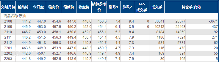 上海原油價格上漲,主力合約2108終盤收于448.6元/桶,漲7.4元/桶,漲幅1.68%。