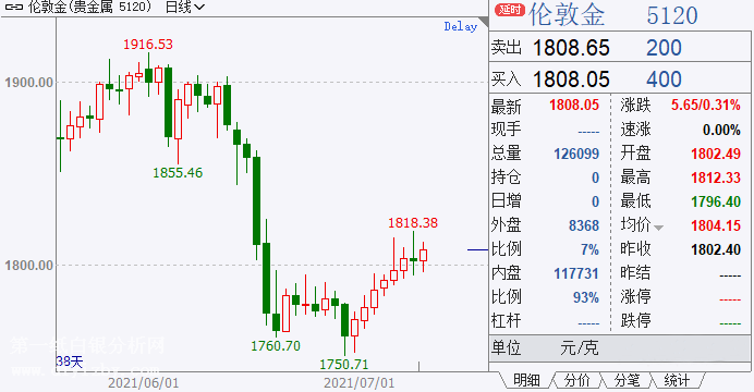道明證券大宗商品策略主管巴特梅萊克(bartmelek)表示:“我們在delta變體方面仍存在問題。這可能會減緩經(jīng)濟發(fā)展,不僅是在美國,當然還有全球。由于投資者確信美聯(lián)儲真正的目標是實現(xiàn)充分就業(yè),而且并不特別擔心通脹率會在一段時間內(nèi)超過目標,我們可能會看到金價在年底突破1850美元。”