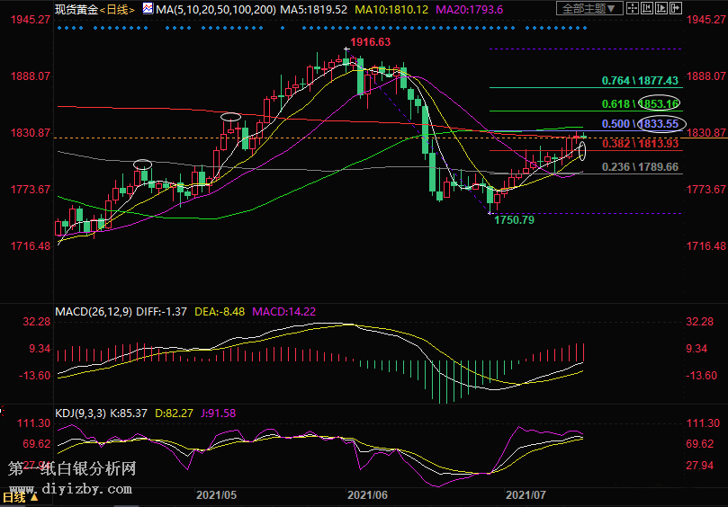 日線級別:金價周四小幅上漲,創一個月新高,但是上方觸及50%回撤位1833強阻力,短線有承壓回落的概率。