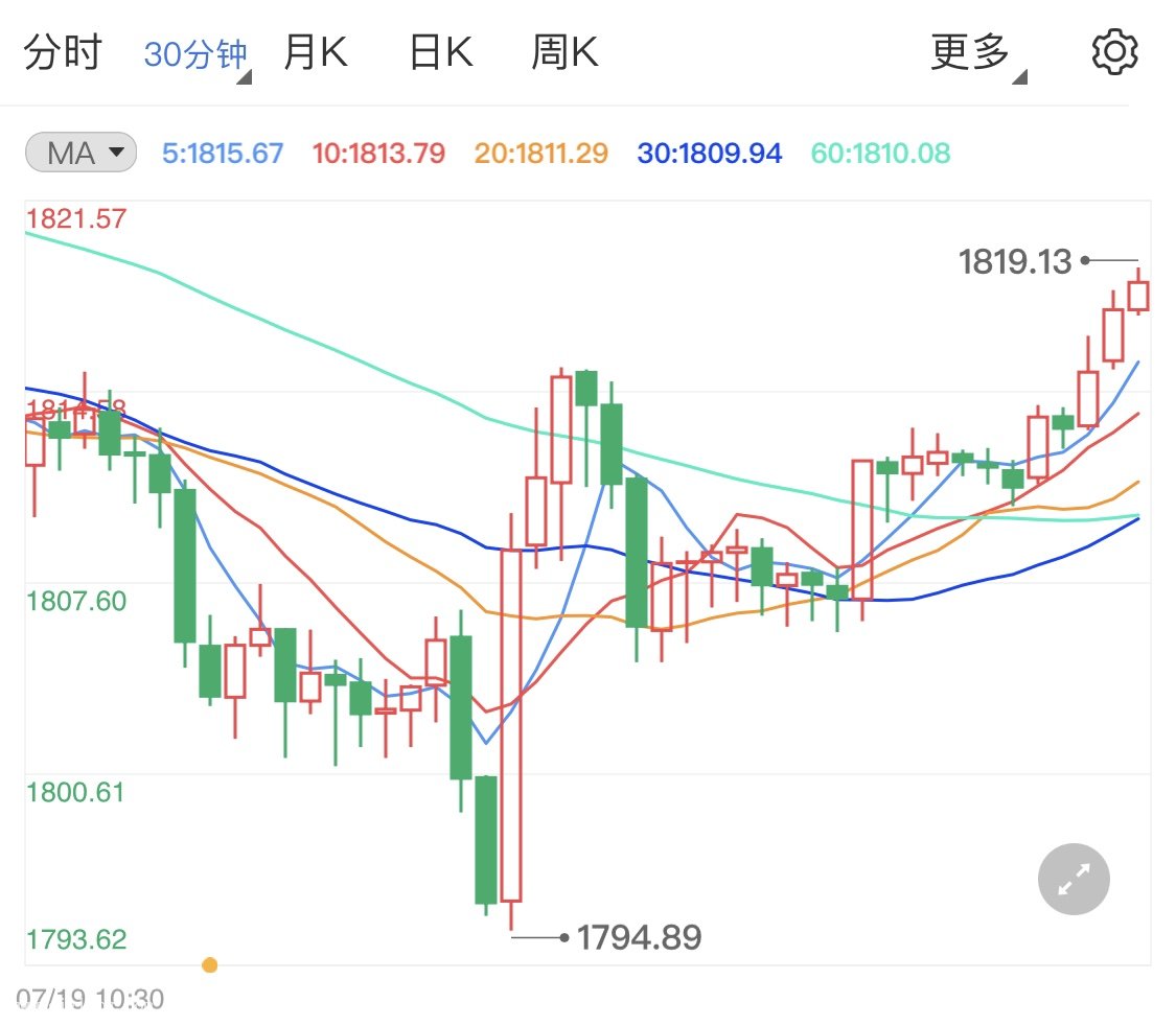 今日金價支撐1800、1794;壓力1820、1825、1833,盤面的強弱分水線在1810。