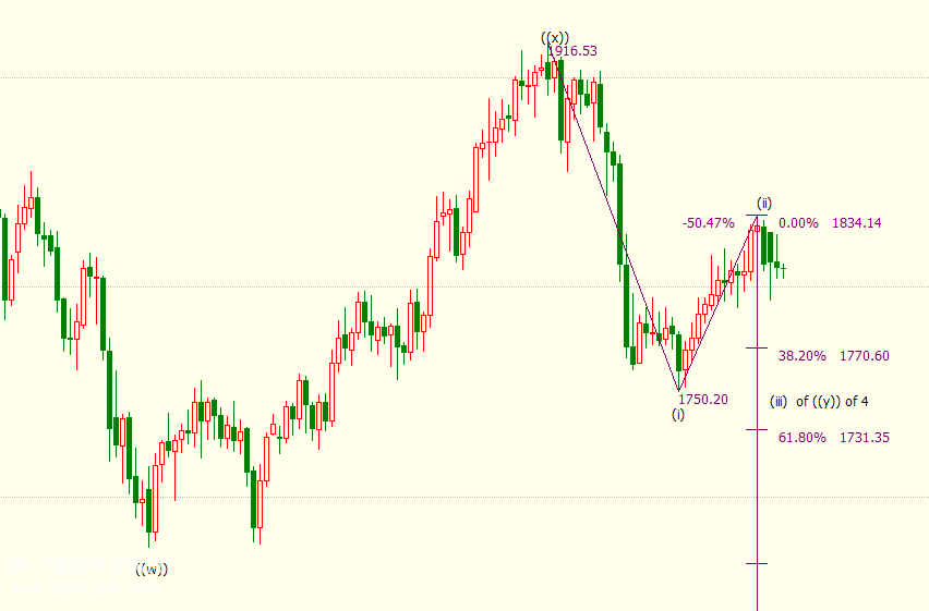 在日線圖上,金價(jià)從1834美元開始向下(III)波走勢,再次跌破1800美元。預(yù)計(jì)未來將探索38.2%和1771美元的目標(biāo)(III)該波是從1917美元開始的向下((y))波的子波,該波是自2075美元調(diào)整后的4個(gè)波的子波。