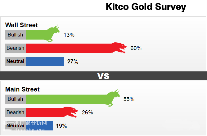上周,15位華爾街預(yù)測(cè)人士參與了kitco的黃金調(diào)查。在受訪者中,有9位預(yù)測(cè)人士(60%)預(yù)計(jì)本周金價(jià)將下跌;同時(shí),兩位預(yù)測(cè)人士(13%)預(yù)計(jì)本周金價(jià)將上漲,四位預(yù)測(cè)人士(27%)預(yù)計(jì)近期金價(jià)將橫向調(diào)整。與此同時(shí),這項(xiàng)針對(duì)散戶的網(wǎng)上調(diào)查共收到571張罰單。在這些受訪者中,315人(55%)預(yù)計(jì)本周金價(jià)將上漲。另有146人(26%)認(rèn)為金價(jià)會(huì)下跌,110人(19%)對(duì)市場(chǎng)持平預(yù)期。