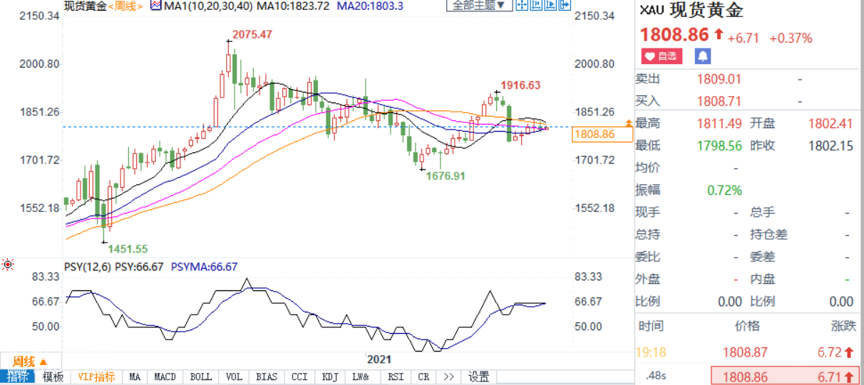 北京時間19:23,國際現貨黃金價格報1808.98美元/盎司,漲0.38%。