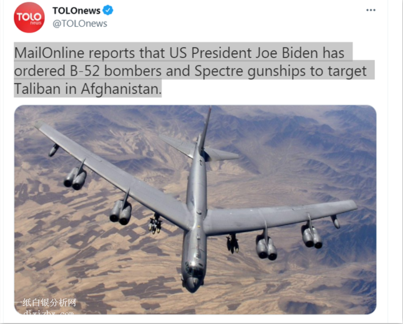 據(jù)央視新聞8月8日報道,當?shù)貢r間8月7日,據(jù)《阿富汗黎明新聞》報道,美國總統(tǒng)拜登命令駐阿富汗美軍使用B-52轟炸機和幽靈炮艇襲擊襲擊阿富汗主要城市的塔利班陣地。