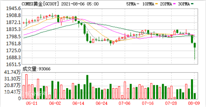 COMEX最活躍的黃金期貨合約在北京時間8月9日06:48的一分鐘內立即交易了2612手,總交易合約價值為4.55億美元。在北京時間8月9日06時57分的一分鐘內,3220手合同立即成交,總成交合同價值5.5億美元。隨后,現(xiàn)貨銀在短期內反彈,回到23美元/盎司以上,將日內跌幅縮小至5.35%;現(xiàn)貨金反彈至1700美元/盎司以上,盤中跌幅收窄至3.15%。與此同時,美國和布匹的石油價格下跌了2%以上。