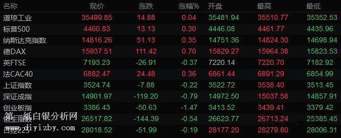 美國(guó)股市收盤(pán):道瓊斯指數(shù)上漲14.88點(diǎn),漲幅0.04%,收于35499.85點(diǎn);標(biāo)準(zhǔn)普爾500指數(shù)上漲13.13點(diǎn),漲幅0.30%,收于4460.83點(diǎn);納斯達(dá)克綜合指數(shù)上漲51.13點(diǎn),漲幅0.35%,至14816.26點(diǎn)。