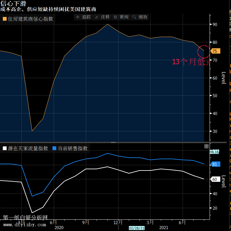 由于價格和成本居高不下,供應持續短缺,美國住宅建筑商信心指數8月份跌至13個月低點。根據全國住宅建筑商協會(NAHB)/富國銀行周二發布的數據,衡量建筑商信心的指數連續第三個月下降,從7月的80降至75,為2020年4月以來的最大降幅。彭博社調查的經濟學家預計中值持平于80。