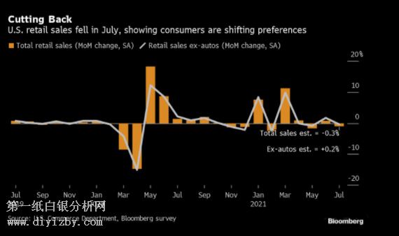 7月份美國零售銷售的跌幅超過預期,反映出消費者支出正穩步轉向服務業,隨著通脹上升,消費者可能對價格越來越敏感。美國商務部周二宣布,上個月零售總額下降1.1%,上月數據上調至增長0.7%。彭博社調查的經濟學家預測中值下降0.3%。不包括汽車在內的零售銷售下降0.4%,受汽車和電子商務銷售下降的拖累,零售總收入遠低于預期。餐飲支出增加,但增長率低于前幾個月。