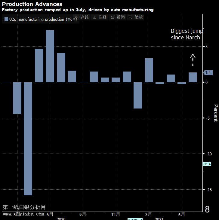 美國7月份制造業產出創下4個月來最大增幅,反彈至疫情爆發前的水平之上,這表明制造商正試圖解決供應鏈混亂和供應短缺的問題。周二公布的數據顯示,7月份制造業產值環比增長1.4%;經六月份調整后,下跌0.3%。7月份,包括采礦和公用事業在內的工業總產值增長了0.9%。彭博社調查的經濟學家預計,制造業產值中值環比增長0.7%,工業產值環比增長0.5%。盡管結果包括汽車產量激增,但本月的產量增長幅度相當大。