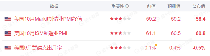 金銀:美國10月ISM制造業指數下降,物價支付指數繼續攀升,新訂單指數低迷,疲軟數據令美元指數重挫失守94,金銀獲得喘息。不過,目前FOMC會議在即,市場相對謹慎,暫時觀望為主。
