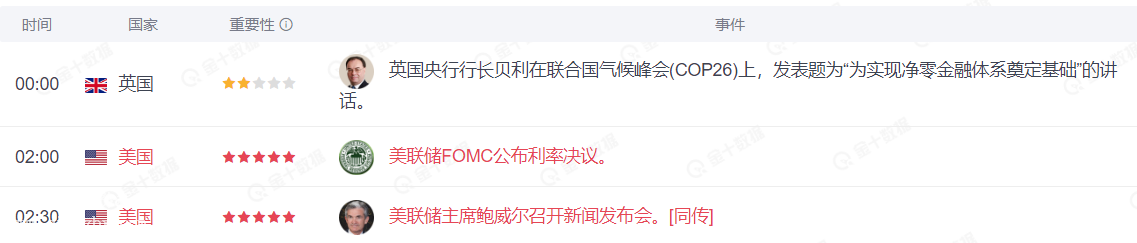 金銀:北京時間周四凌晨2點,美聯儲將公布11月利率決議,鮑威爾在之后30分鐘舉行新聞發布會。市場已押注美聯儲明年將加息兩次,速度遠快于預期,高盛則將加息預估提前了整整一年至2022年7月。11月FOMC正式宣布縮減購債150億左右,屬于大概率事件,已成為普遍共識。若宣布并不存在意外,短期影響較為有限;若縮減購債的規模超出市場預期速度,可能誘發市場緊縮過快的擔憂,則推升美債收益率和美元,重挫貴金屬及全球資產;若縮減購債的規模不及預期,或宣布12月才開始,將提振市場。